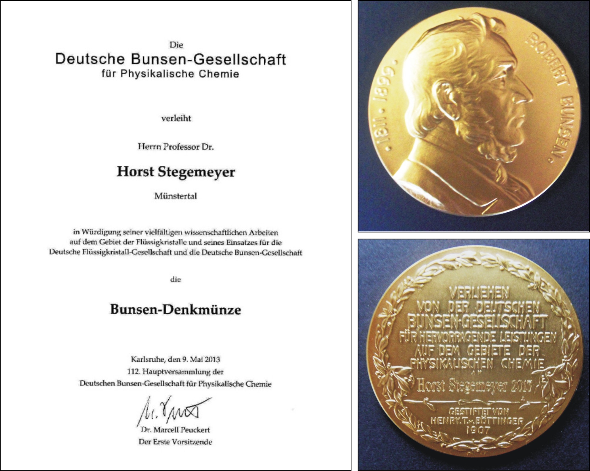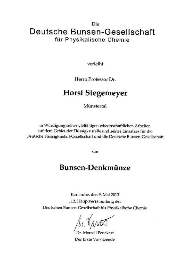 In 2013, Prof. Dr. Horst Stegemeyer (1931-2023) received the Bunsen-Medal in recognition of his scientific work in the field of liquid crystals and for his commitment to the German Liquid Crystal Society and the German Bunsen Society.
